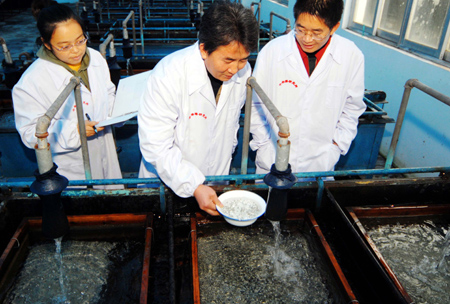Updated: 2007-11-04 11:27 ![]() Researchers work on the hatched alevins of Chinese sturgeon at the Chinese sturgeon Research Institute in Yichang, Central China's Hubei Province, November 3, 2007. For the first time, scientists in the institute successfully bred 100,000 alevins of the endangered fish. [Xinhua]