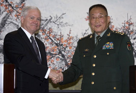 China's Defence Minister Cao Gangchuan (R) shakes hands with visiting US Defense Secretary Robert Gates after a news briefing in Beijing November 5, 2007.[Agencies]