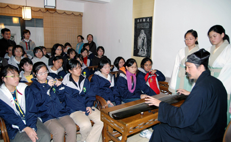 Visiting Singapore students listen to the traditional Chinese music played by a teacher of Suzhou Finishing School. [Xinhua]