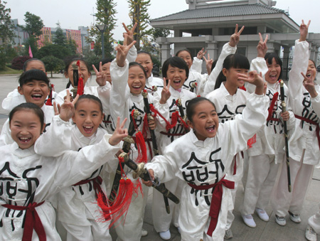 Updated: 2007-11-18 14:58 ![]() Young sword dancers celebrate after performing at the closing ceremony of the Sword and Celadon Festival in Longquan, East China's Zhejiang Province, November 17, 2007. Swords produced in Longquan are famous around the country. [Xinhua]