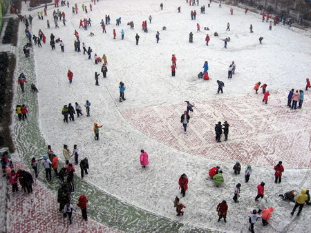 Students play on a ground in a primary school when the first snow this winter falls down in Jilin city, Northeast China's Jilin Province November 19, 2007. Most areas in the three northeastern Chinese provinces experienced the snowfall Monday. The heavy snowfall disrupted air flights, expressway traffic and urban transport in the northeastern China provinces. [Xinhua]