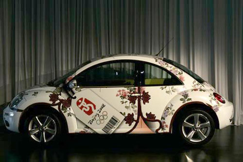 A Volkswagen Beetle in Olymic clothes. The 5th China (Guangzhou) International Automobile Exhibition - the last grand automobile exhibition in China for 2007 entered the second day at the Guangzhou International Convention & Exhibition Center on Nov. 21. Citizens and auto lovers had a great opportunity to get access to over 20 concept cars, more than 80 cars of new models and other vehicles initially launched worldwide provided by nearly 400 enterprises from home and abroad. [Agencies]