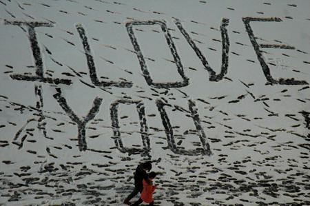 Two students walk across a basketball court covered by snow at a university in Urumqi, Northwest China's Xinjiang Uygur Autonomous Region, November 24, 2007. It's the first snowfall this winter in northern Xinjiang, marking the real beginning of the winter there, meteorologists say. [newsphoto]