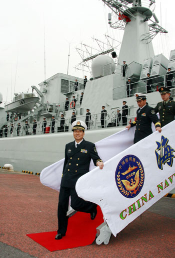 Rear Admiral Xiao Xinnian, vice chief of staff of the South China Sea Fleet of the PLA Navy and other officers get off missile destroyer Shenzhen after it docked at Harumi pier in Tokyo November 28, 2007. The warship arrived in Tokyo on Wednesday for the first such port call since World War Two, in the latest sign of warming ties between the Asian neighbours. [Xinhua]