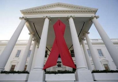 A large AIDS ribbon hangs from the North Portico of the White House in Washington November 30, 2007, recognizing World AIDS Day which is on December 1. [Agencies]