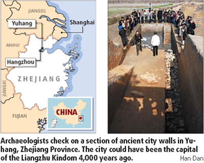 The Liangzhu ancient city ruins - found in Yuhang county of Zhejiang Province - can be traced back at least 4,300 years, and cover an area of 2.9 million square meters with the city walls 4-6 meters in width. The first discovery was made in June last year when apartment buildings were to be built in Putaoban Village of Yuhang. Archaeologists were called in because the village is part of the Neolithic Liangzhu Culture protection zone. It is centered on Yuhang and extends to present day Zhejiang, Jiangsu, Anhui and Jiangxi provinces as well as Shanghai. The Liangzhu Culture of 5,300-4,000 years ago in East China has yielded many exquisite artworks for religious use, most notably jade artifacts. Under a patch of rice field, archaeologists found a 40-meter-wide ancient ditch built of hardened earth, in which were large amounts of pottery shards, Liu Bin, a researcher at the Zhejiang Archaeological Institute, said over the weekend. When archaeologists dug a deep hole on the eastern bank of the north-south ditch, they were surprised to find a large area built of hammered soil and pebbles. Further excavations showed that the ditch was a canal outside the city, and the area to its east was the remains of part of the city wall. The walls extended 1,500-1,700 m from east to west and 1,800-1,900 m from north to south. The city covers an area of 2.9 million sq m, 200,000 sq m more than the Forbidden City. It is the largest Neolithic city discovered in China, said Yan Wenming, a professor at Peking University. "The city could have been the capital of the Liangzhu Kingdom," he was quoted by the Hangzhou-based Metropolitan Express News as saying. Historians have long speculated about the existence of such a kingdom 4 millennia ago, Liu Qingzhu, director of the Archaeological Research Institute of the Chinese Academy of Social Sciences, told China Daily Monday. Further evidence is needed to prove the city was the capital of the kingdom, he said. "There should be remains of palaces if there used to be a political power. The essence of statehood lies in its government, not just in the walls." If a political power existed so long ago on the east coast, it is a mystery as to how it faded away, he added. |