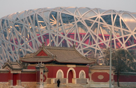 The National Stadium, also known as "Bird's Nest", is seen behind a temple built in the Ming Dynasty in Beijing December 4, 2007. In order to preserve the temple built to worship a fairy in Chinese fables called Jade Maiden of Mountain Tai (Bixiayuanjun), the construction site of the National Stadium was moved about 100 meters northward from the one originally planned, according to Beijing Municipal Administration of Cultural Heritage. [newsphoto]