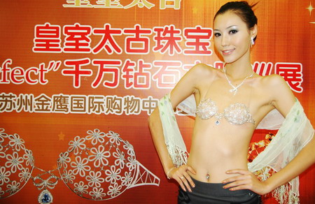 A model wears a bra made of over 2,500 diamonds weighing over 100 carats at a department store in Suzhou, East China's Jiangsu Province December 8, 2007. [newsphoto]