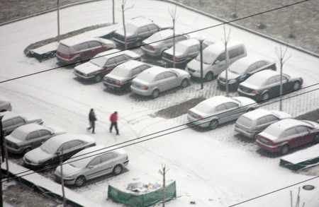 Parked cars in a residential community in Beijing are layered with snow early Monday morning, December 10, 2007. [newsphoto]