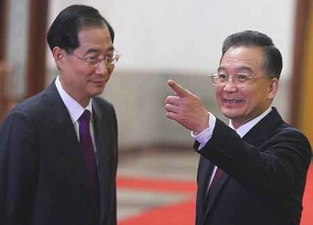 China's Premier Wen Jiabao meets with Prime minister Han Duck-soo of the Republic of Korea (ROK) at the Great Hall of the People in Beijing December 10, 2007. [Xinhua]