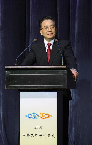 China's Premier Wen Jiabao speaks at the closing ceremony of the Exchange Year between China and Korea in Beijing December 10, 2007. [Xinhua]