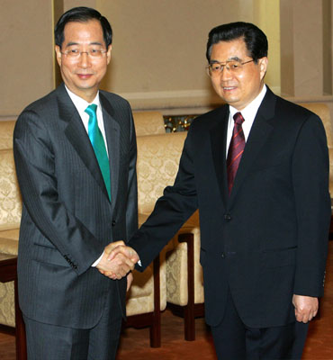![]() Chinese President Hu Jintao (R) meets visiting South Korean Prime Minister Han Duck-Soo at the Great Hall of the People in Beijing December 11, 2007. Han's two-day visit will mark the 15th anniversary of the establishment of diplomatic relations between the two countries. [Agencies]