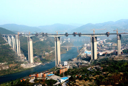 Updated: 2007-12-12 09:48 ![]() The Wujiang Mega Bridge is seen under construction over the Wujiang River near Guiyang, Southwest China's Guizhou Province, December 11, 2007. The tallest pier of the 1,452-meter-long bridge stands 173.5 meters high, and the bridge will open to traffic before the new year. [Xinhua]
