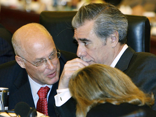 US Treasury Secretary Henry Paulson (L) confers with Secretary of Commerce Carlos Gutierrez and Trade Representative Susan Schwab (back to camera) during the opening of The Third Strategic Economic Dialogue in Xianghe, near Beijing December 12, 2007. [Agencies] |