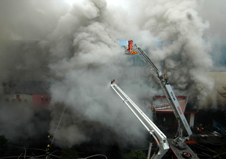 Updated: 2007-12-12 16:15 ![]() Firefighters extinguish a fire as heavy smoke billows from an apartment building in Wenzhou, East China's Zhejiang Province, December 12, 2007. The fire killed at least 21 people, and the cause of the disaster is under investigation. [Xinhua]