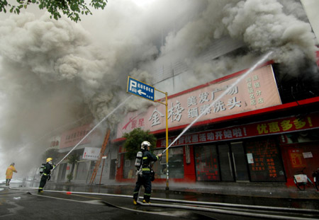 Updated: 2007-12-12 16:15 ![]() Firefighters hose water into a shop on fire in Wenzhou, East China's Zhejiang Province, December 12, 2007. At least 21 people were confirmed dead in the fire in an 28-storey apartment building. [Xinhua]