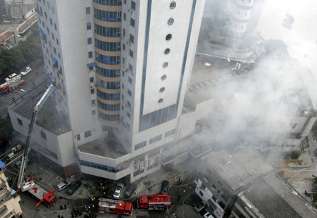 Smoke billows from a shop in an apartment building as firefighters try to extinguish the fire in Wenzhou, East China's Zhejiang Province, December 12, 2007. The fire killed at least 21 people, and the cause of the disaster is under investigation. [Xinhua]