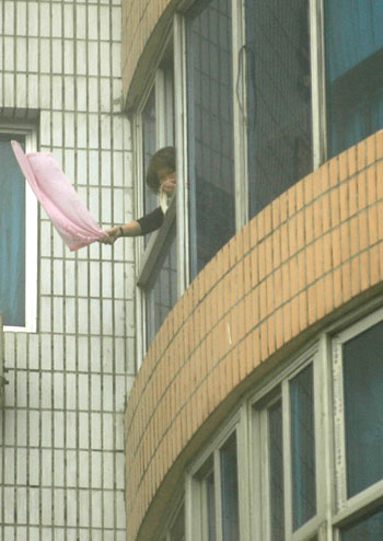 Updated: 2007-12-12 16:15 ![]() A woman waves a towel for help from a window of the apartment building on fire in Wenzhou, East China's Zhejiang Province, December 12, 2007. At least 21 people were killed in the fire and the cause of the disaster is under investigation. [Xinhua] |