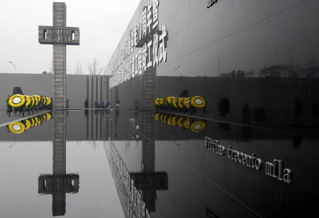 Paramilitary police hold wreaths during a rehearsal for a ceremony marking the 70th anniversary of the start of the Nanjing Massacre at the Nanjing Massacre Museum, Jiangsu province, December 12, 2007. Activities will be held on December 13 to commemorate the 1937 massacre, when Japanese troops killed more than 300,000 Chinese civilians and captives, raped more than 20,000 and burned down one-third of the urban buildings. [newsphoto]