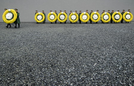 Paramilitary police hold wreaths during a rehearsal for a ceremony marking the 70th anniversary of the start of the Nanjing Massacre at the Nanjing Massacre Museum, Jiangsu province, December 12, 2007. Activities will be held on December 13 to commemorate the 1937 massacre, when Japanese troops killed more than 300,000 Chinese civilians and captives, raped more than 20,000 and burned down one-third of the urban buildings. [newsphoto]