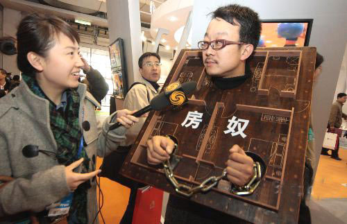 Action artist Liang Kegang (R) is interviewed at the 9th China International Real Estate & Archi-Tech Fair (CIHAF) in Beijing on December 11, 2007. [cnsphoto]