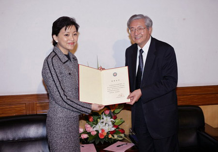 Yang Lan (L) and President of Peking University Xu Zhihong jointly show the donation certificate in this undated photo. [Pkuef.org]