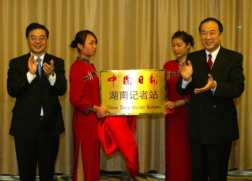 Zhou Qiang (L), governor of Central China's Hunan Province, and Zhu Ling (R), editor-in-chief of China Daily, applaud at the opening ceremony of China Daily's Hunan Bureau, in Changsha, Hunan Province, December 21, 2007. The Hunan Bureau marks the first step of China Daily's new endeavor to expand local coverage. [Chinadaily.com.cn]