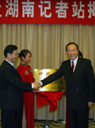 Zhou Qiang (L), governor of Central China's Hunan Province, and Zhu Ling (R), editor-in-chief of China Daily, shake hands at the opening ceremony of China Daily's Hunan Bureau, in Changsha, Hunan Province, December 21, 2007. [Chinadaily.com.cn]