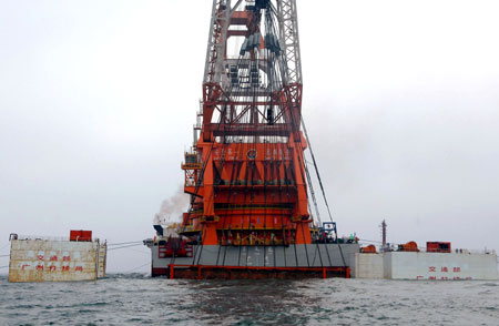 A salvage barge lifts a specially designed basket containing the wreck of the 800-year-old merchant ship 'Nanhai No. 1' from the waters off the South China Coast near Yangjiang, South China's Guangdong Province Friday, December 21, 2007. [Xinhua]