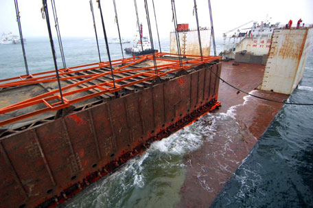 A specially designed basket containing the wreck of the 800-year-old sunken merchant ship 'Nanhai No.1', is lifted completely out of the waters off the South China Coast near Yangjiang,  Guangdong Province, December 22, 2007. [Xinhua]
