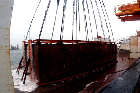 A specially designed basket containing the wreck of the 800-year-old sunken merchant ship 'Nanhai No.1', is lifted completely out of the waters off the South China Coast near Yangjiang, Guangdong Province, December 22, 2007. [Xinhua]