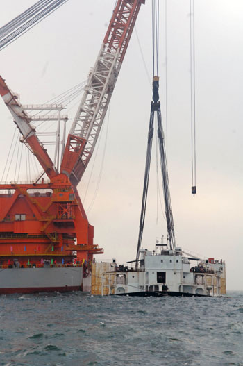 A salvage barge lifts a specially designed basket containing the wreck of the 800-year-old merchant ship 'Nanhai No. 1' from the waters off the South China Coast near Yangjiang, South China's Guangdong Province Friday, December 21, 2007. [Xinhua]