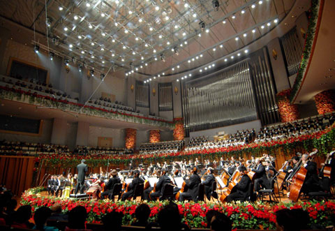 China National Symphony Orchestra and Beijing Symphony Orchestra make a joint performance at the National Grand Theatre in Beijing December 22, 2007. The theatre, a shiny half sphere that sits next to the Great Hall of the People in downtown Beijing, opens on Saturday. [Xinhua]