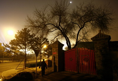 A man walks outside the entrance of a traditional alleyway, or hutong, on the other side of the National Grand Theatre in Beijing December 22, 2007. The theatre, a shiny half sphere that sits next to the Great Hall of the People in downtown Beijing, opens on Saturday. [Agencies]