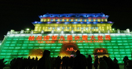 People flock to a park to see the ice sculptures at the annual Harbin Ice and Snow World (Festival) in Harbin, Northeast China's Heilongjiang Province December 23, 2007. It's the ninth year the Ice City showcases ice sculptures in winter, which sets "Ice World, Olympic Dream" as the theme this year. [Xinhua]