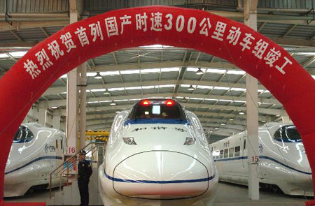 Updated: 2007-12-25 16:36 ![]() A home-made CRH2-300 high speed train rolls off the production line in Qingdao, East China's Shandong Province, December 22, 2007. The bullet train is designed to run more than 300 kilometers per hour, and is among the fastest trains in the world. [Xinhua]