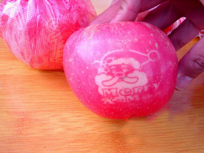 Apples with the image of Santa Claus, wrapped up in colorful gift paper, are sold at four yuan, or half a US dollar, each in Yantai University in East China's Shandong Province on Tuesday, December 25, 2007. [CRI]