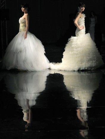 Models don dresses from the wedding collection of Turkmenistan's fashion house "Gulzaman" (Time of Flowers) in Ashgabat December 28, 2007. [Agencies]