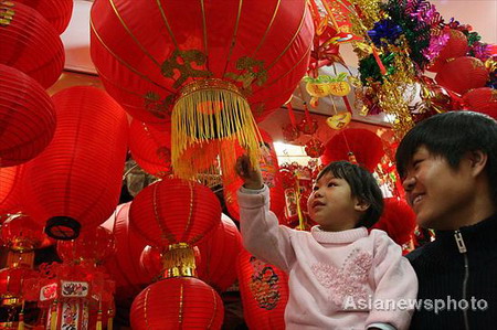 A little girl is attracted by red lanterns in Beijing's superstore December 29, 2007. [newsphoto]