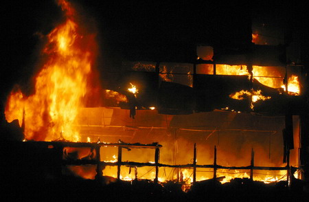 A strong fire and heavy smoke engulfed a 12-storey wholesale market building in Urumqi, capital of Northwest China's Xinjiang Uygur Autonomous Region, early Thursday, January 3, 2008. It is still unknown how many people were injured or killed in the fire, which broke out around 8:20 pm on Wednesday. [Xinhua]