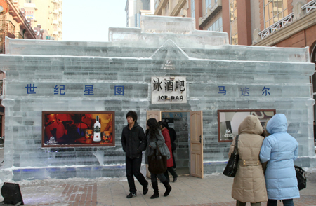 People walk past an ice bar in Harbin, capital of northeast China's Heilongjiang Province, Jan. 2, 2008. Customers could enjoy roast meat, hot coffee and vodka in the bar built with ice within the next 50 days. [Xinhua]