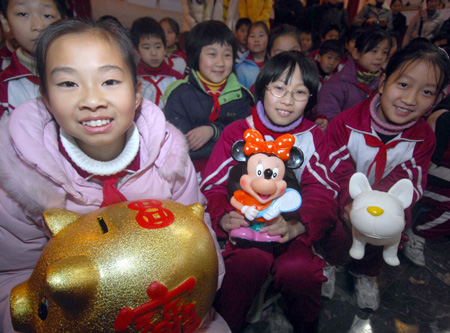 School students bring their saving boxes during a campaign in Hangzhou, East China's Zhejiang Province, to call on children to donate their deposits to impoverished students in rural areas, January 12, 2008. The organizers have collected nearly 300,000 yuan from students in cities around Zhejiang. [Xinhua]