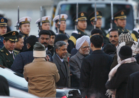 Indian Prime Minister Manmohan Singh (C) is greeted after arriving at Beijing International Airport January 13, 2008. [Agencies]