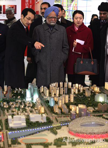 Chen Gang (1st L), vice mayor of Beijing, introduces the model of National Stadium (Bird's Nest) to the visiting Indian Prime Minister Manmohan Singh (2nd L) at the Beijing 2008 Project Exhibition Center in Beijing, January 13, 2008. [Asianewsphoto]