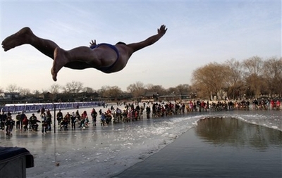 A swimmer leaps towards the icy water at Houhai Lake in Beijing, China, Saturday, Jan. 12, 2008. The lake is popular for tourists throughout the year but when the winter season arrives it becomes one of Beijing's favorite spots for winter time recreation. [Agencies]