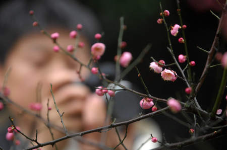 A tourist takes pictures of the plum blossoms at the West Lake in Hangzhou, East China's Zhejiang Province, January 15, 2008. [Xinhua]