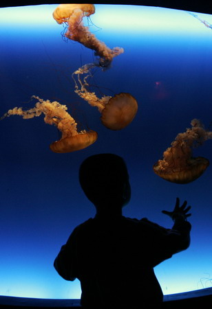 A young visitor looks at a jellyfish exhibition at the Ocean Park aquarium-amusement complex in Hong Kong January 20, 2008. [Agencies]