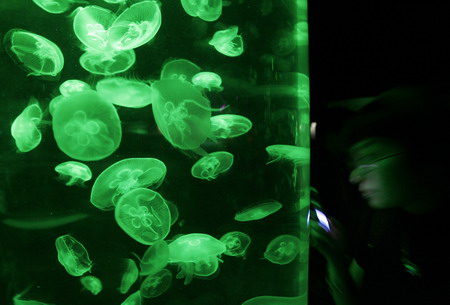 A visitor looks at a jellyfish exhibition at the Ocean Park aquarium-amusement complex in Hong Kong January 20, 2008. [Agencies]