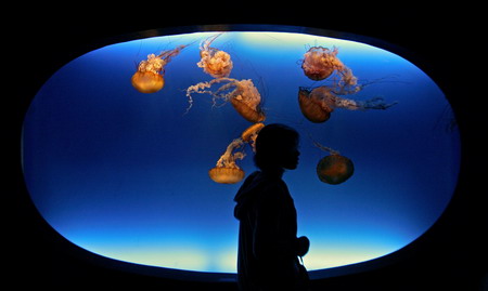 A visitor walks past a jellyfish exhibition at the Ocean Park aquarium-amusement complex in Hong Kong January 20, 2008. [Agencies]