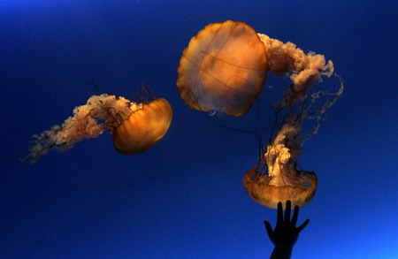 The right hand of a young visitor is silhouetted against a jellyfish exhibition hall at the Ocean Park aquarium-amusement complex in Hong Kong January 20, 2008. [Agencies]